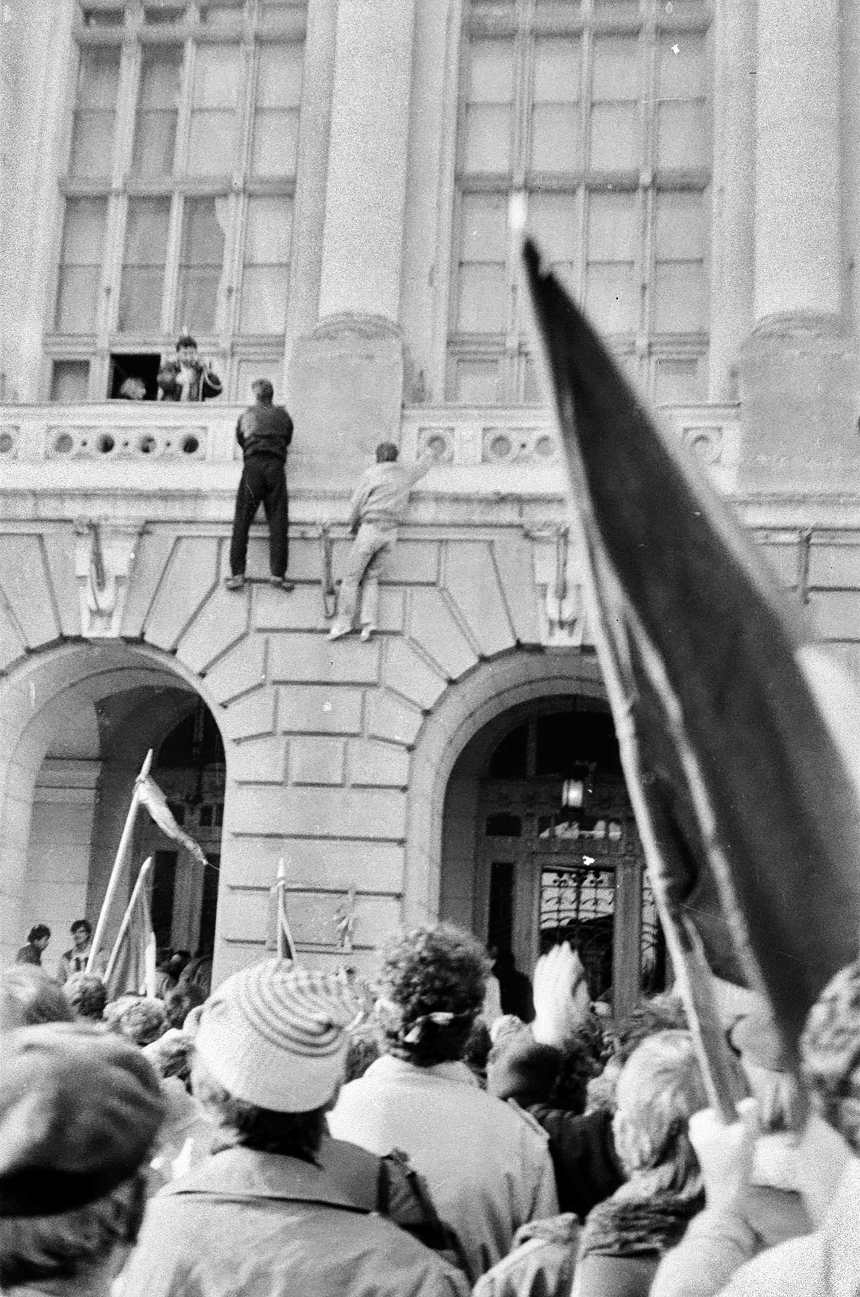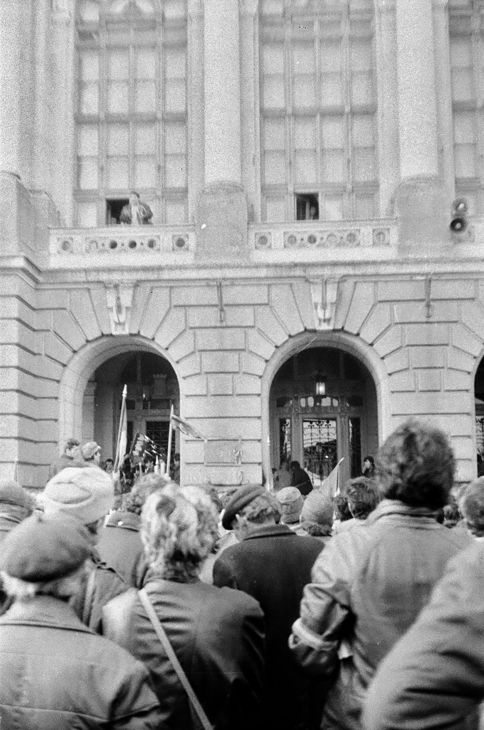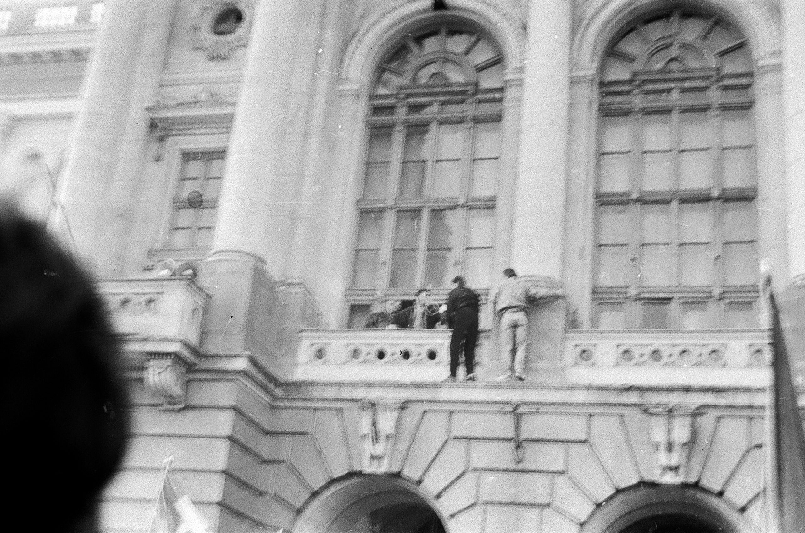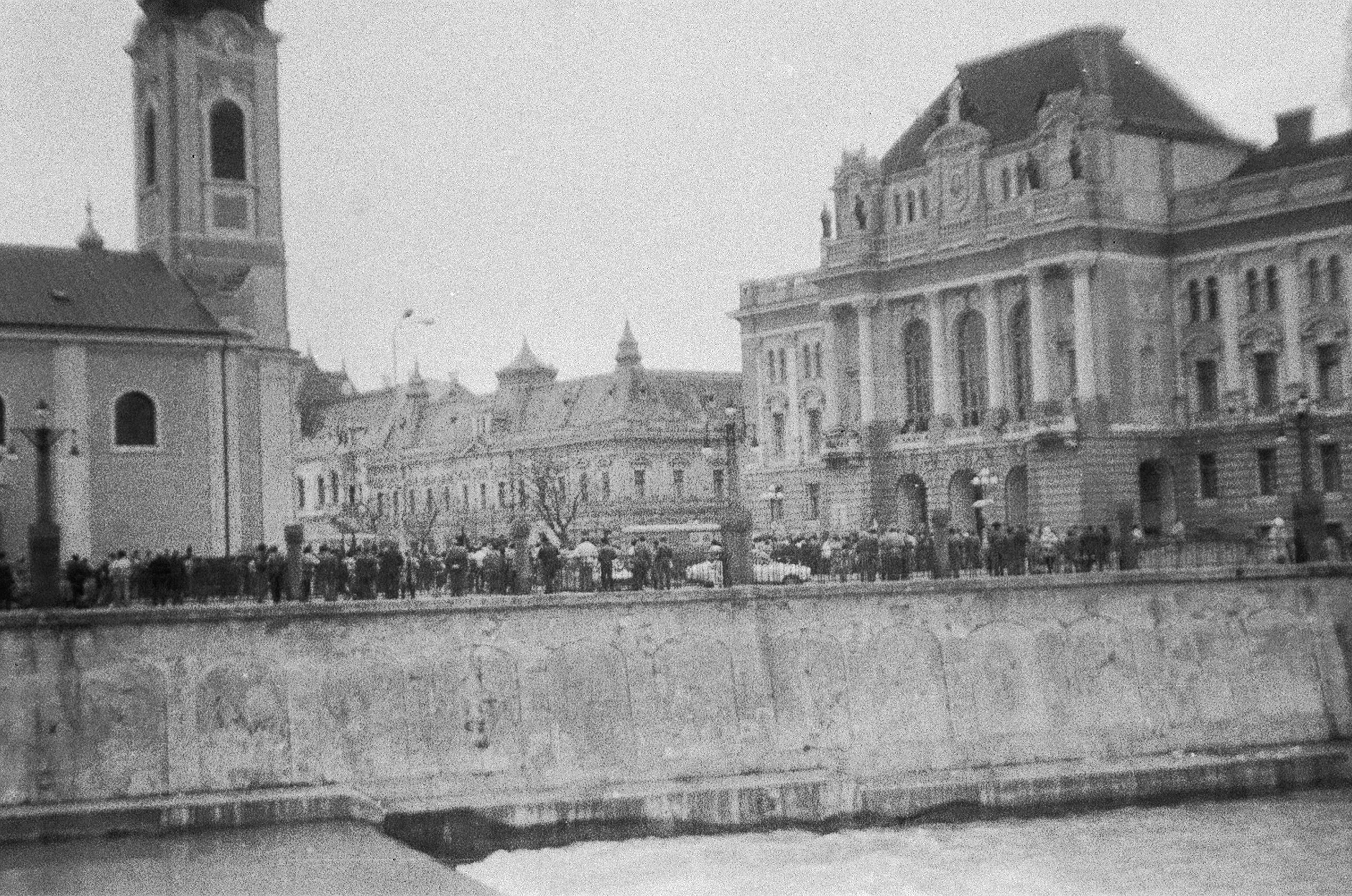 Unele dintre fotografii surprind Piaţa Unirii, fie la primele ore ale diminetii (ceea ce ar putea constitui chiar primele fotografii ale revolutiei orădene), fie în jurul orei 12.00, când Oradea este declarată „oraş liber. Momentul este dovedit de ceasul din turnul Bisericii Sf. Ladislau. O alta reproduce un mesaj inscipţionat pe pereţii Primăriei: „Ceauşescu spânzurat”, lângă care se vede profilul unui copil şi o altă inscripţie, aproape indescifrabilă, referitoare la securişti. În altele regăsim deja steagul găurit, iar în alte două imagini zărim doi oameni căţărându-se pe faţada Primăriei, în încercarea de a urca pe balcon.